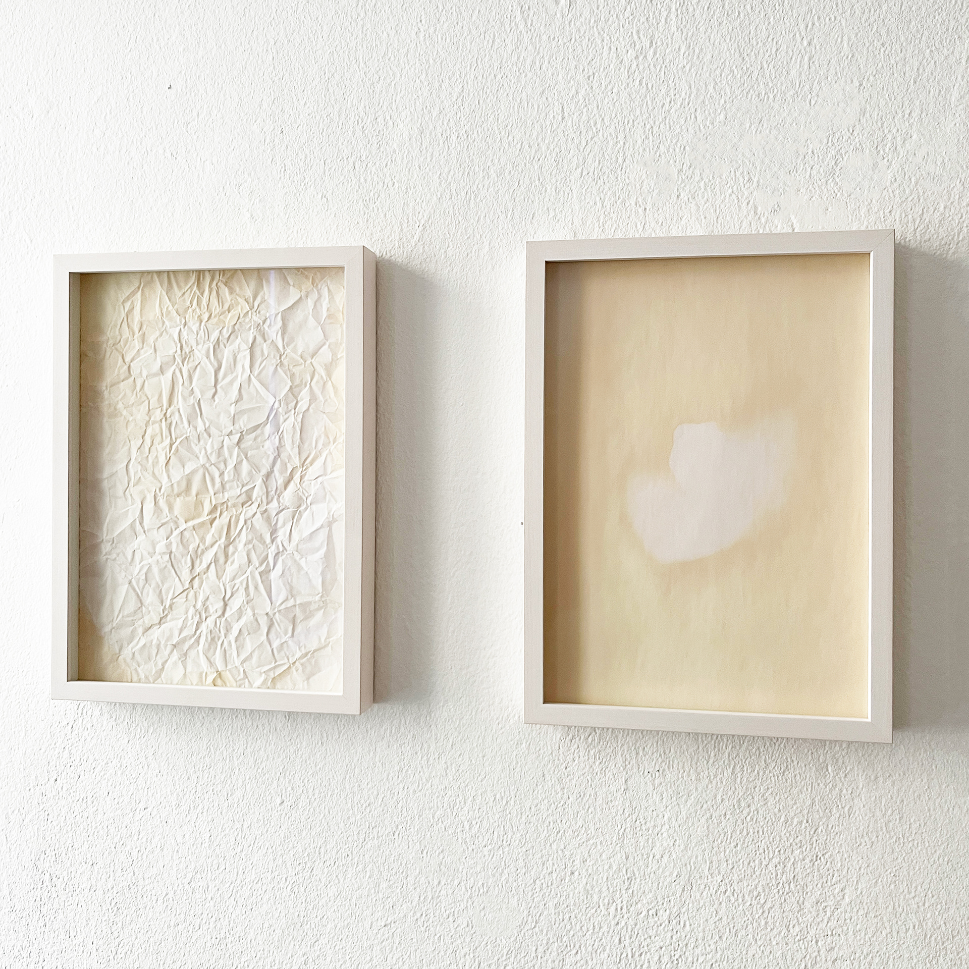 Steffi Lindner, Inscriptions, two fax papers, one crumpled, placed on top of the other, both exposed to the sun, 2016 - 2020
